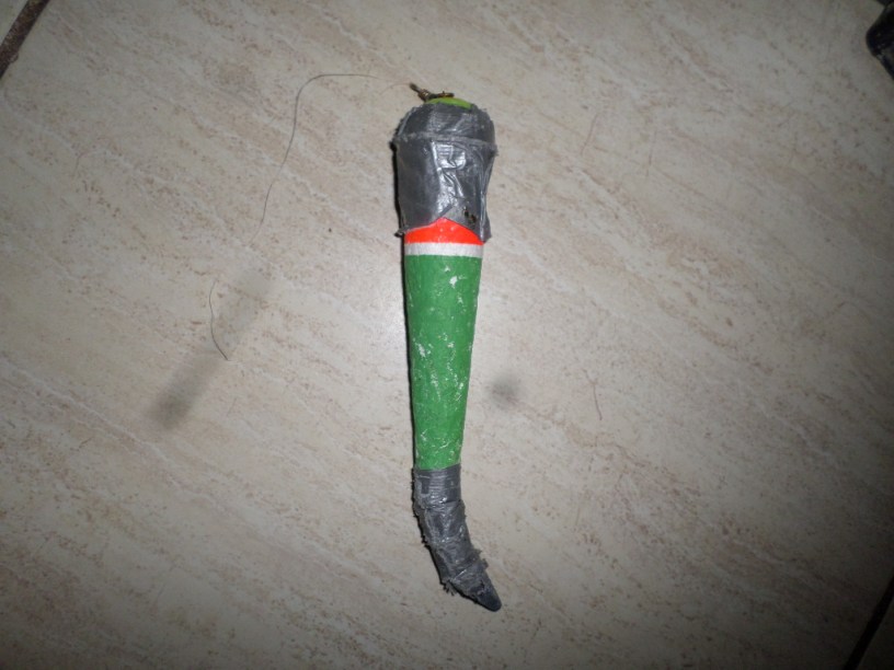 I rarely find these home-made bobbers on the beach. Someone took two bobbers and duct-taped them together.